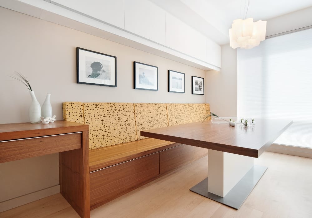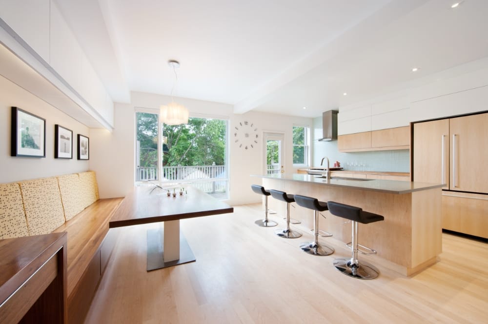 Beginning with the removal of a side entrance leading to the basement and ground floor the plan, was simplified and opened up to provide continuity between the living and dining rooms and kitchen, with an new banquette added adjacent to the kitchen that serves as a common working area.