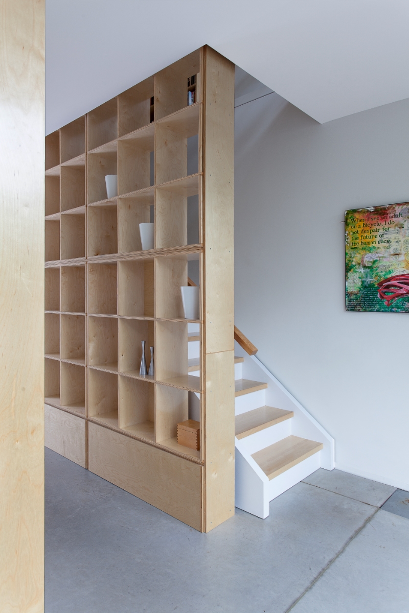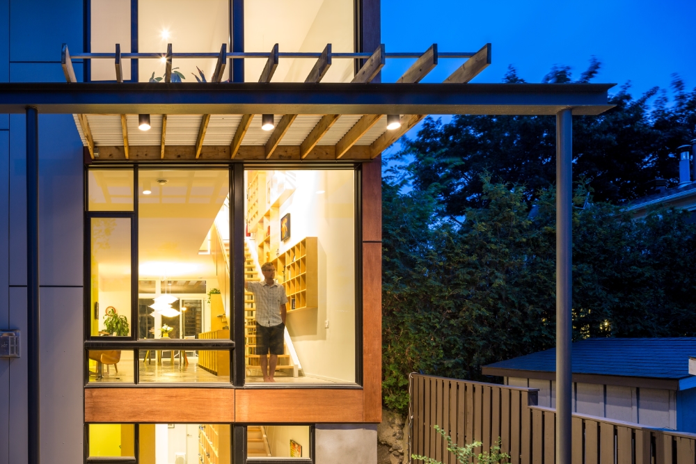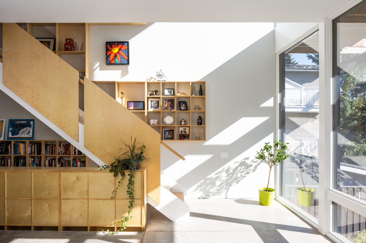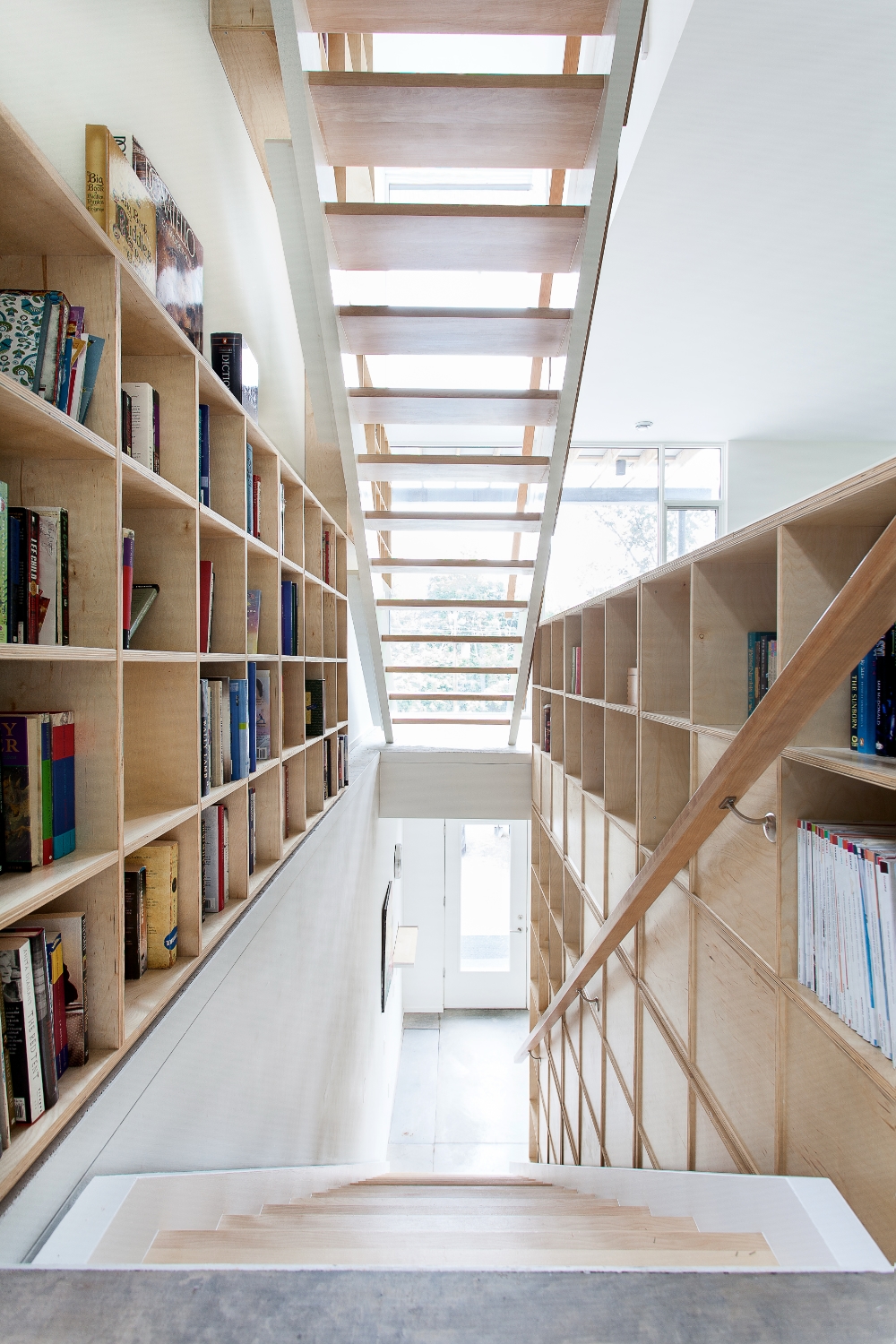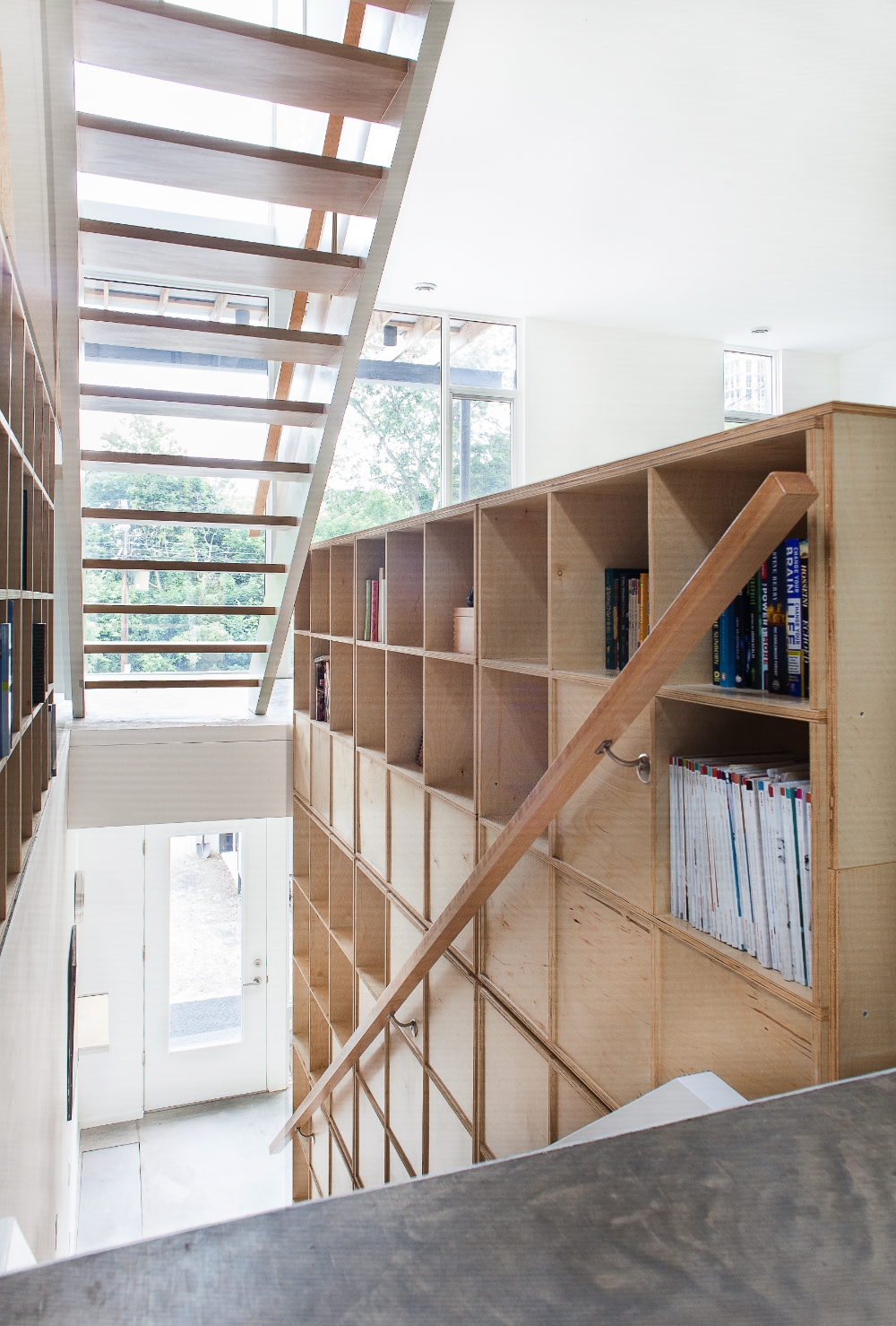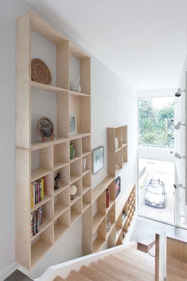 This new home for a young family adapts to and profits from the steep site in downtown Ottawa. The family is tall. Craig (the father) lives in fear of overhead fans. As well, the family has many beautiful things, including books, sculptures, knick knacks, and shoes, and wanted an appealing way to display them. They are also passionate about (and possess many) bicycles.