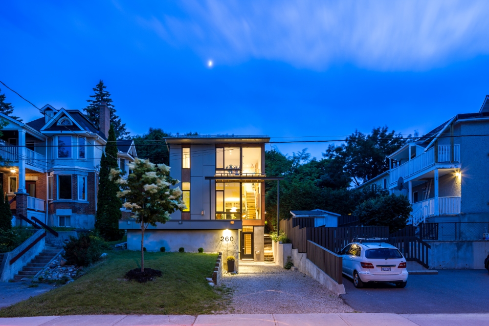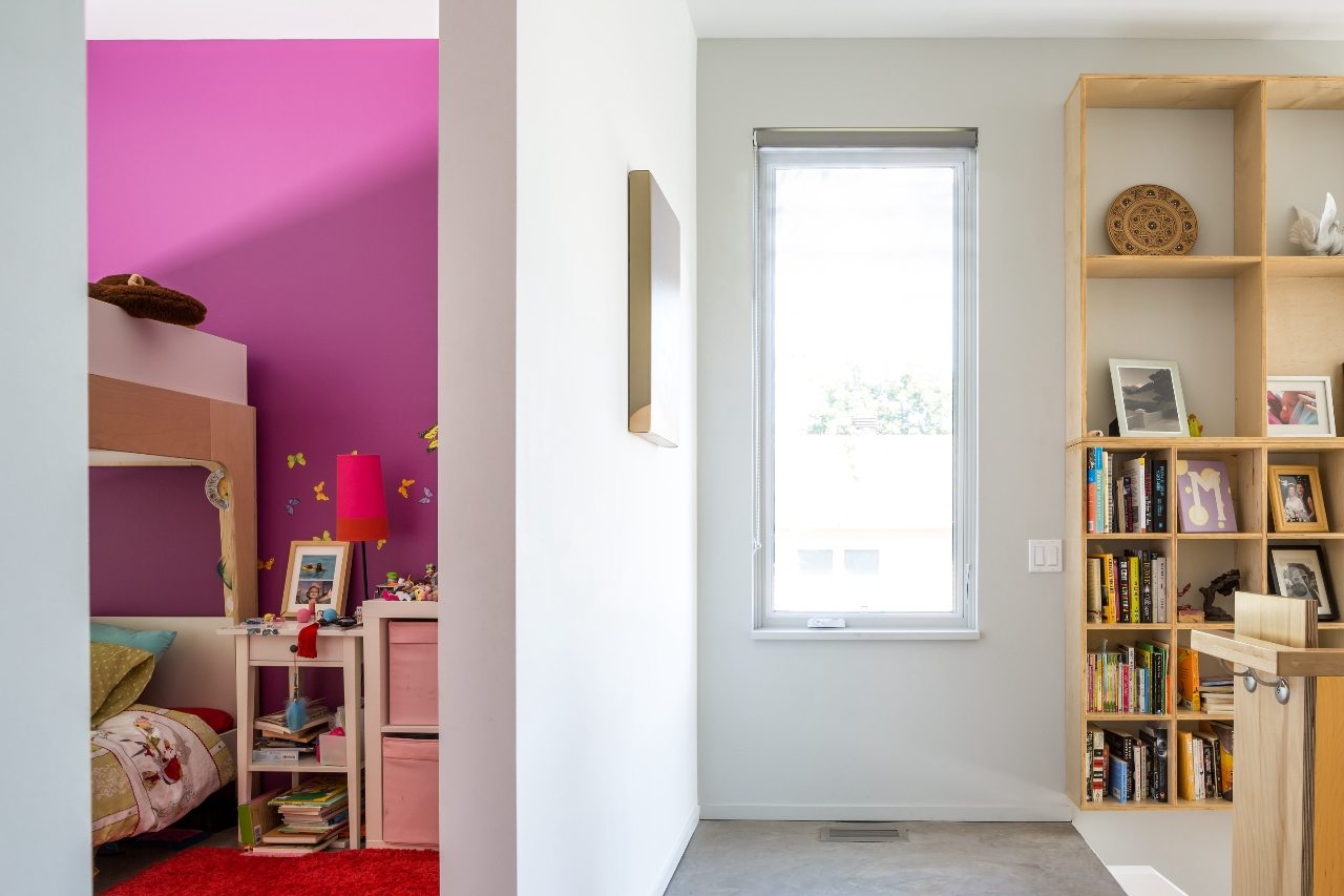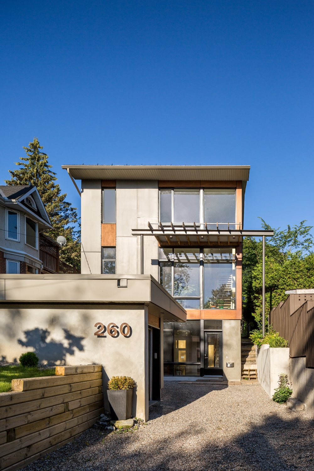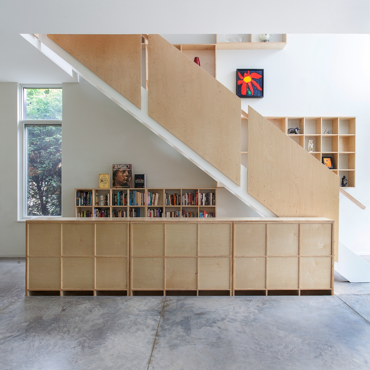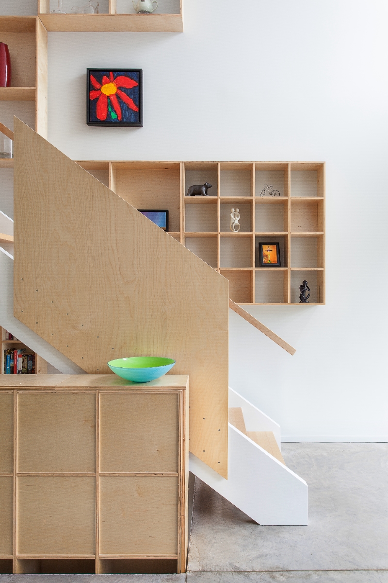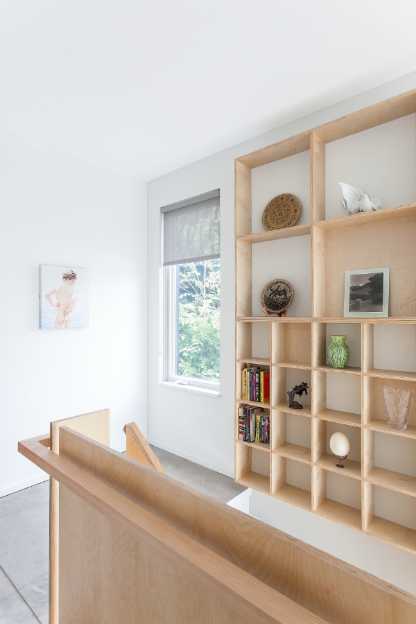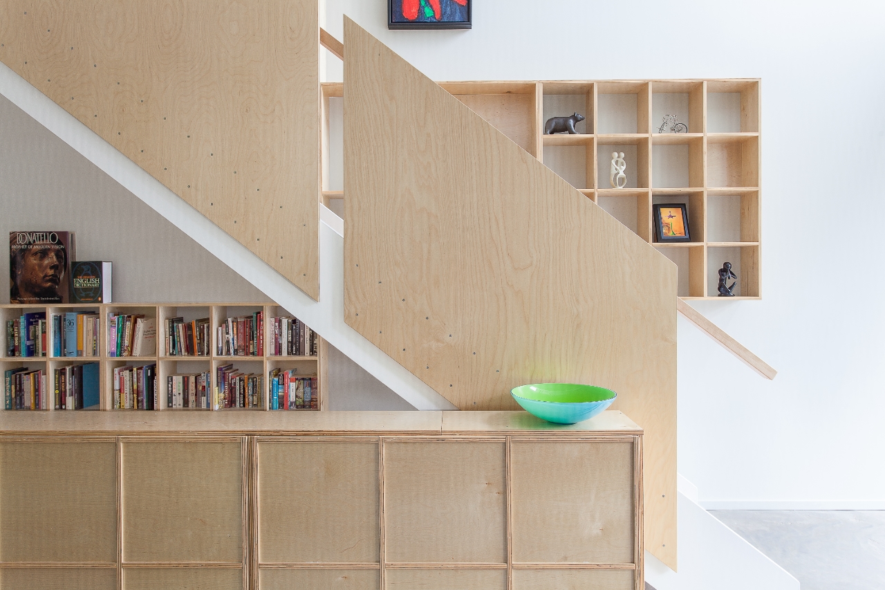 This new home for a young family adapts to and profits from the steep site in downtown Ottawa. The family is tall. Craig (the father) lives in fear of overhead fans. As well, the family has many beautiful things, including books, sculptures, knick knacks, and shoes, and wanted an appealing way to display them. They are also passionate about (and possess many) bicycles.