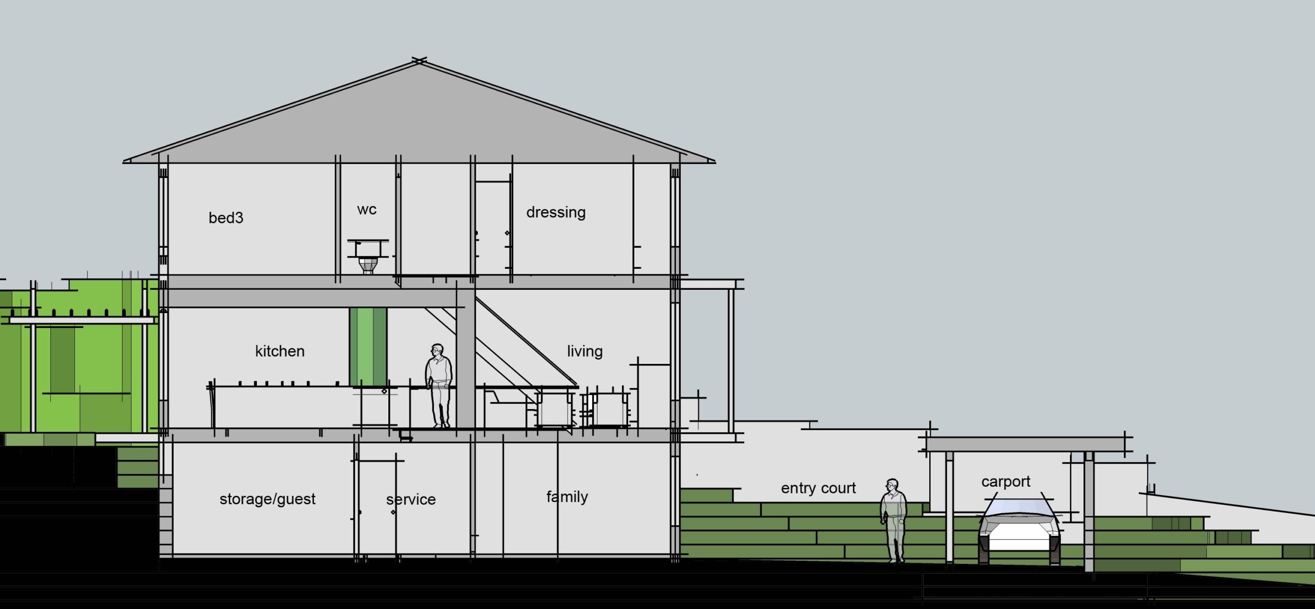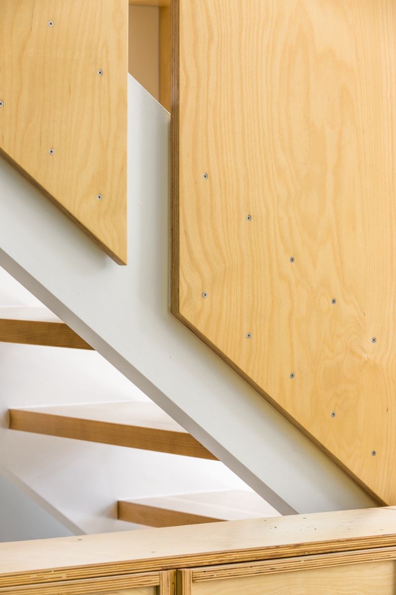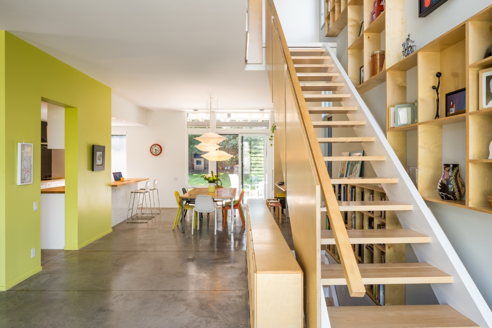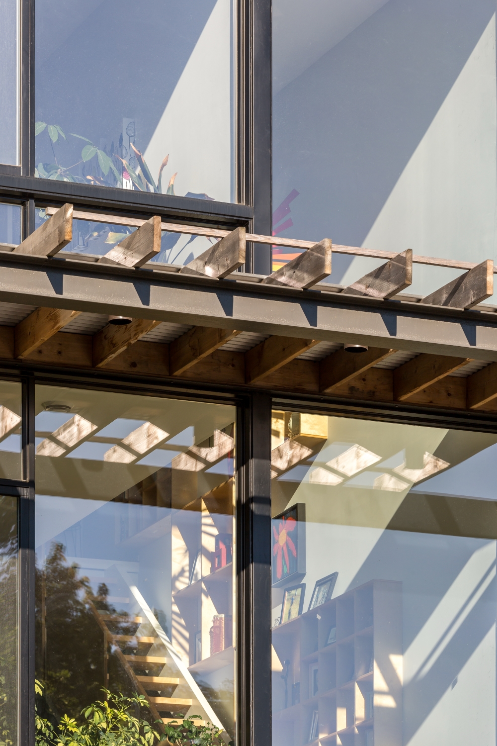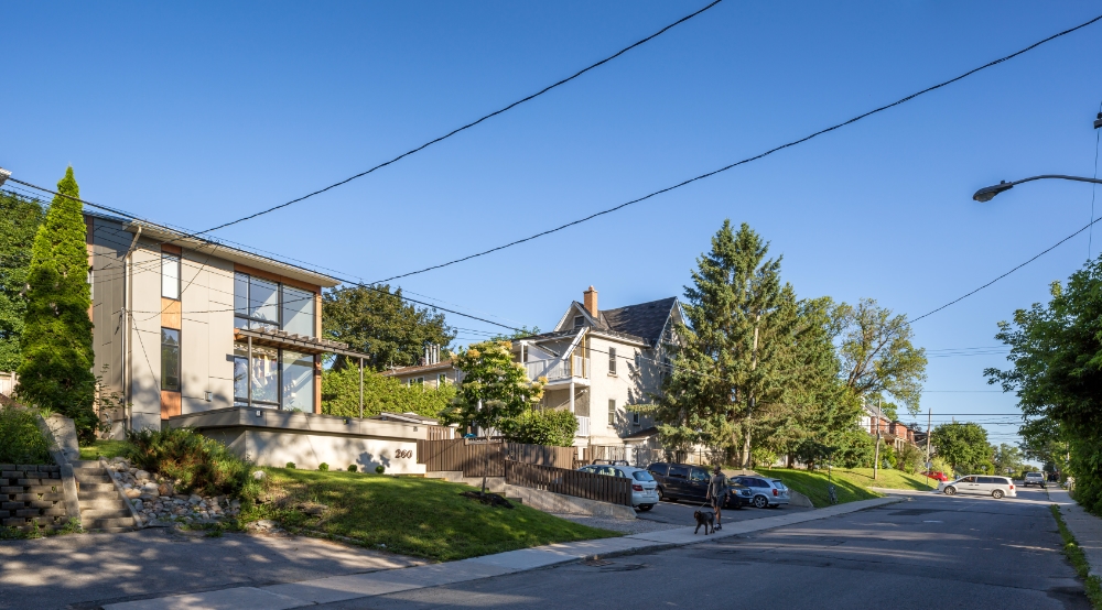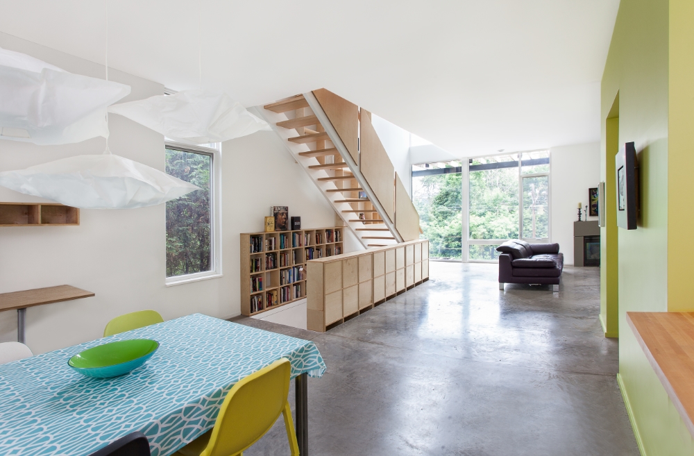 This new home for a young family adapts to and profits from the steep site in downtown Ottawa. The family is tall. Craig (the father) lives in fear of overhead fans. As well, the family has many beautiful things, including books, sculptures, knick knacks, and shoes, and wanted an appealing way to display them. They are also passionate about (and possess many) bicycles.