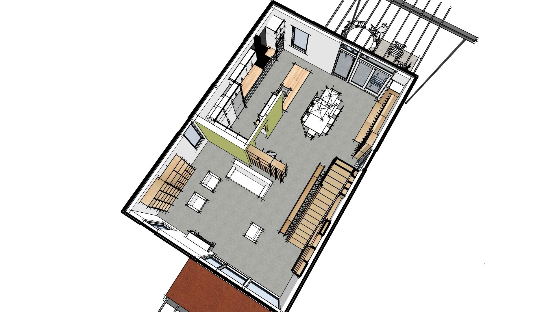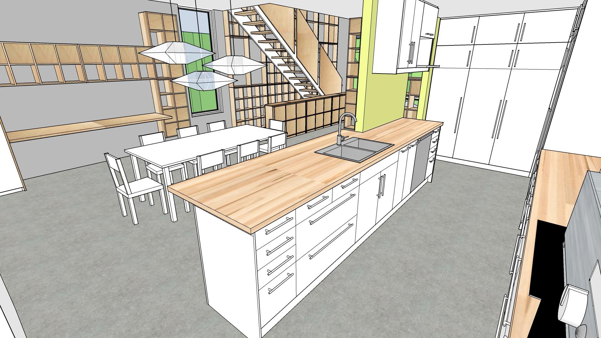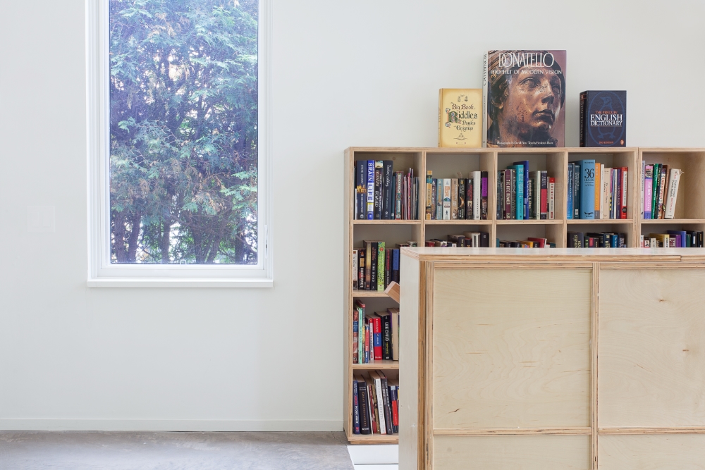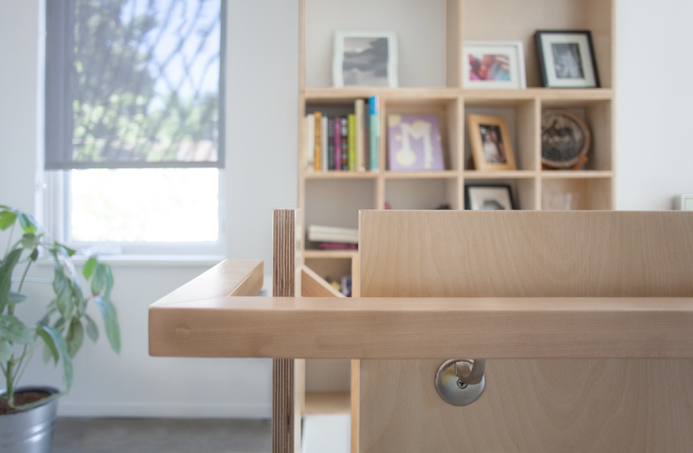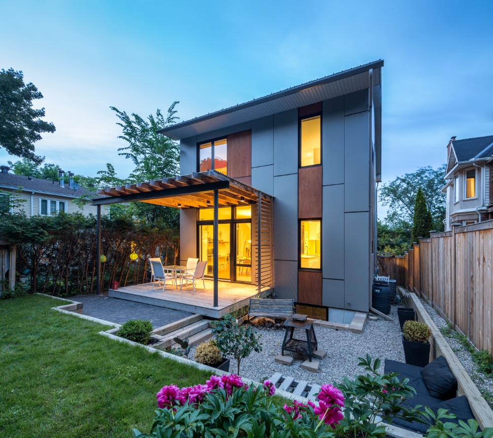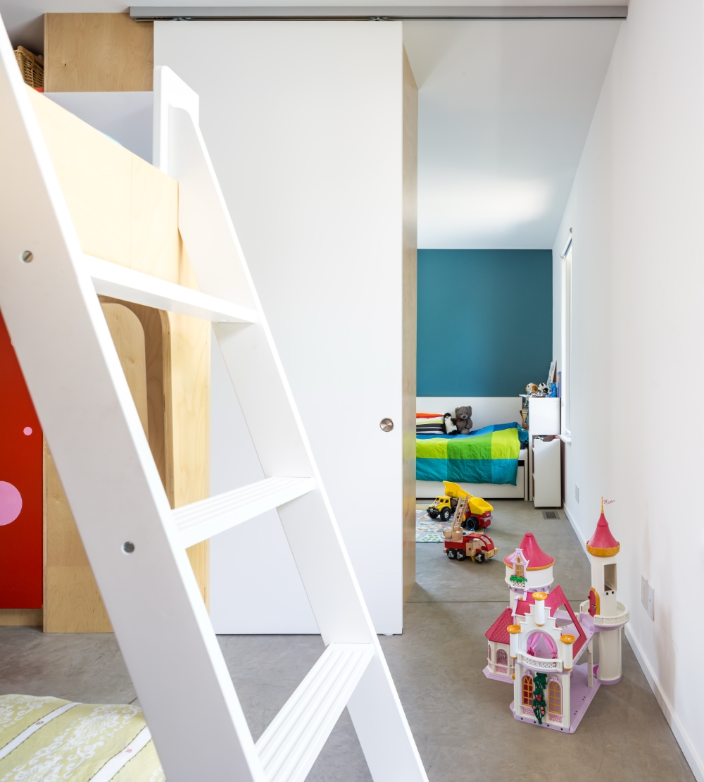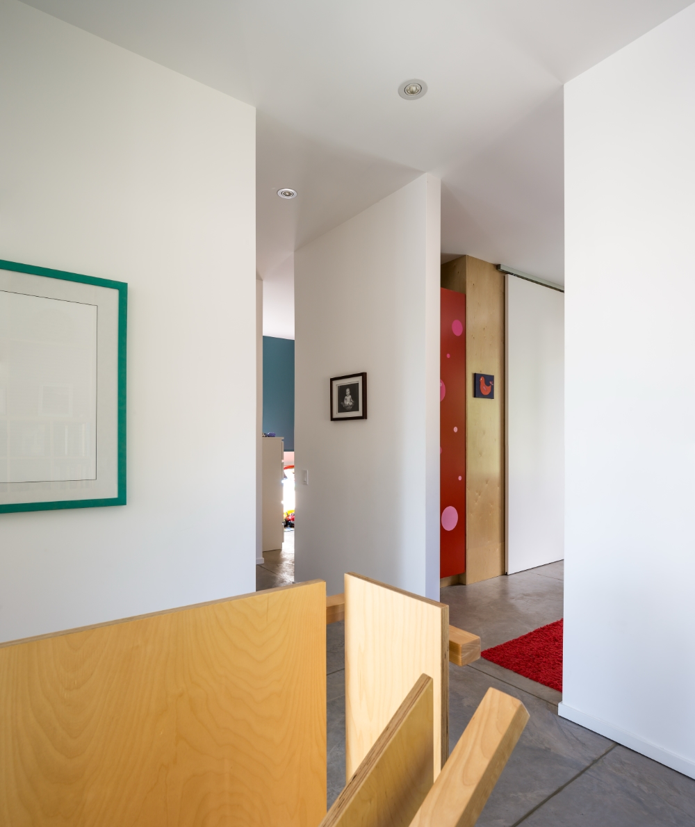 This new home for a young family adapts to and profits from the steep site in downtown Ottawa. The family is tall. Craig (the father) lives in fear of overhead fans. As well, the family has many beautiful things, including books, sculptures, knick knacks, and shoes, and wanted an appealing way to display them. They are also passionate about (and possess many) bicycles.