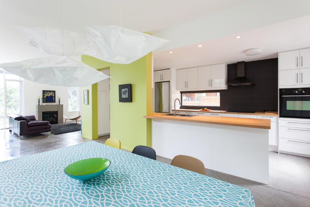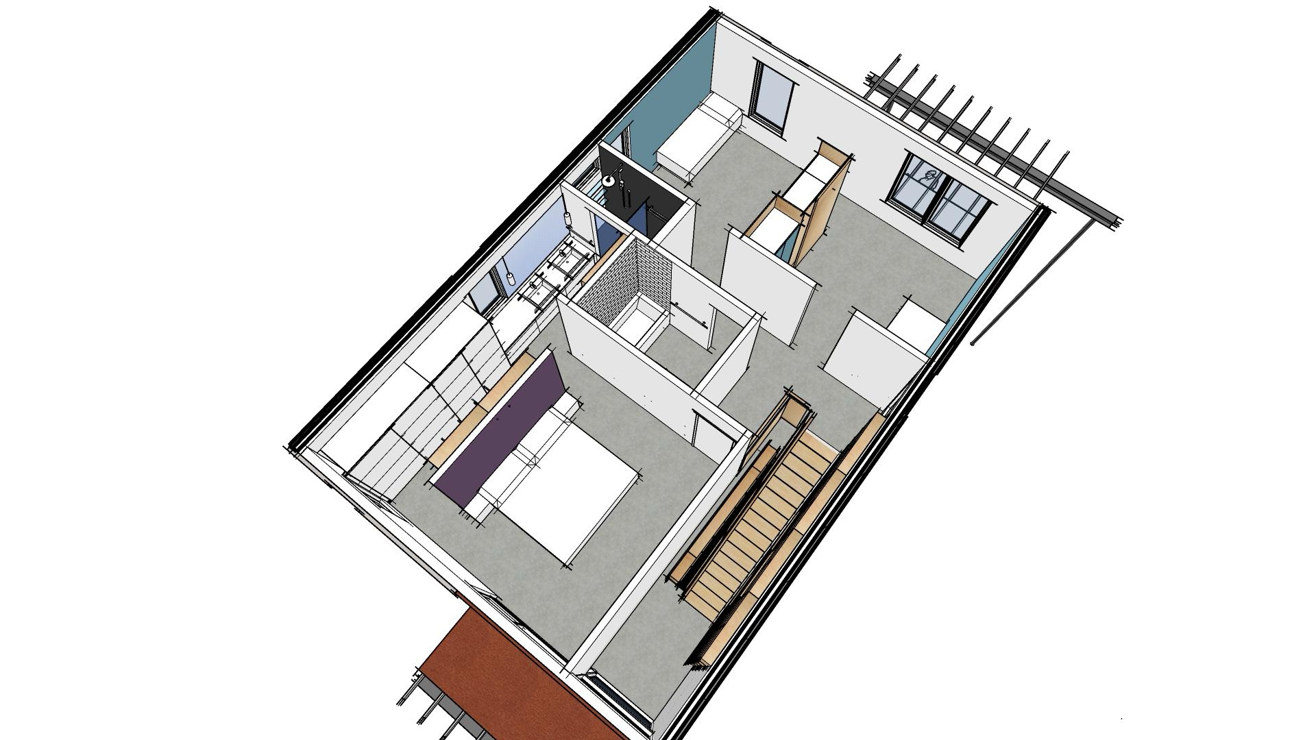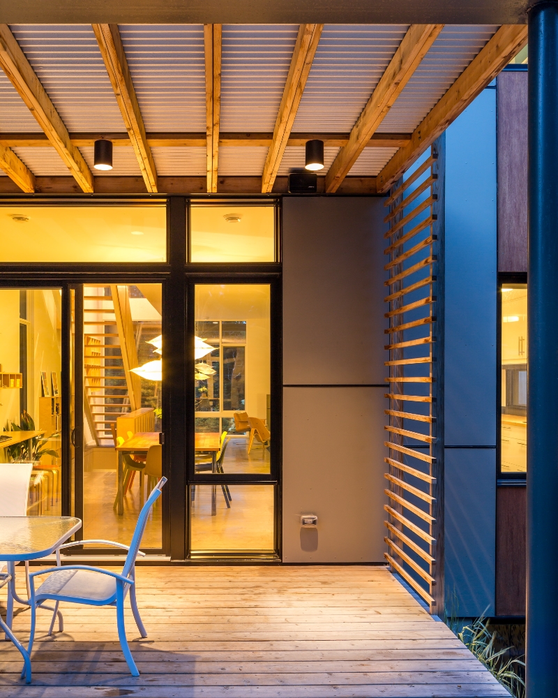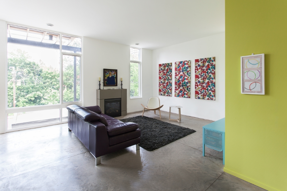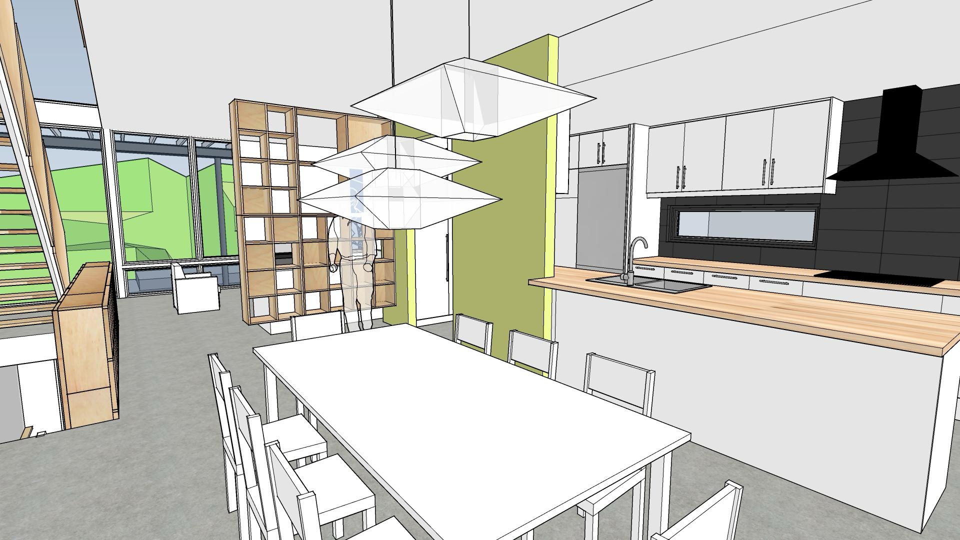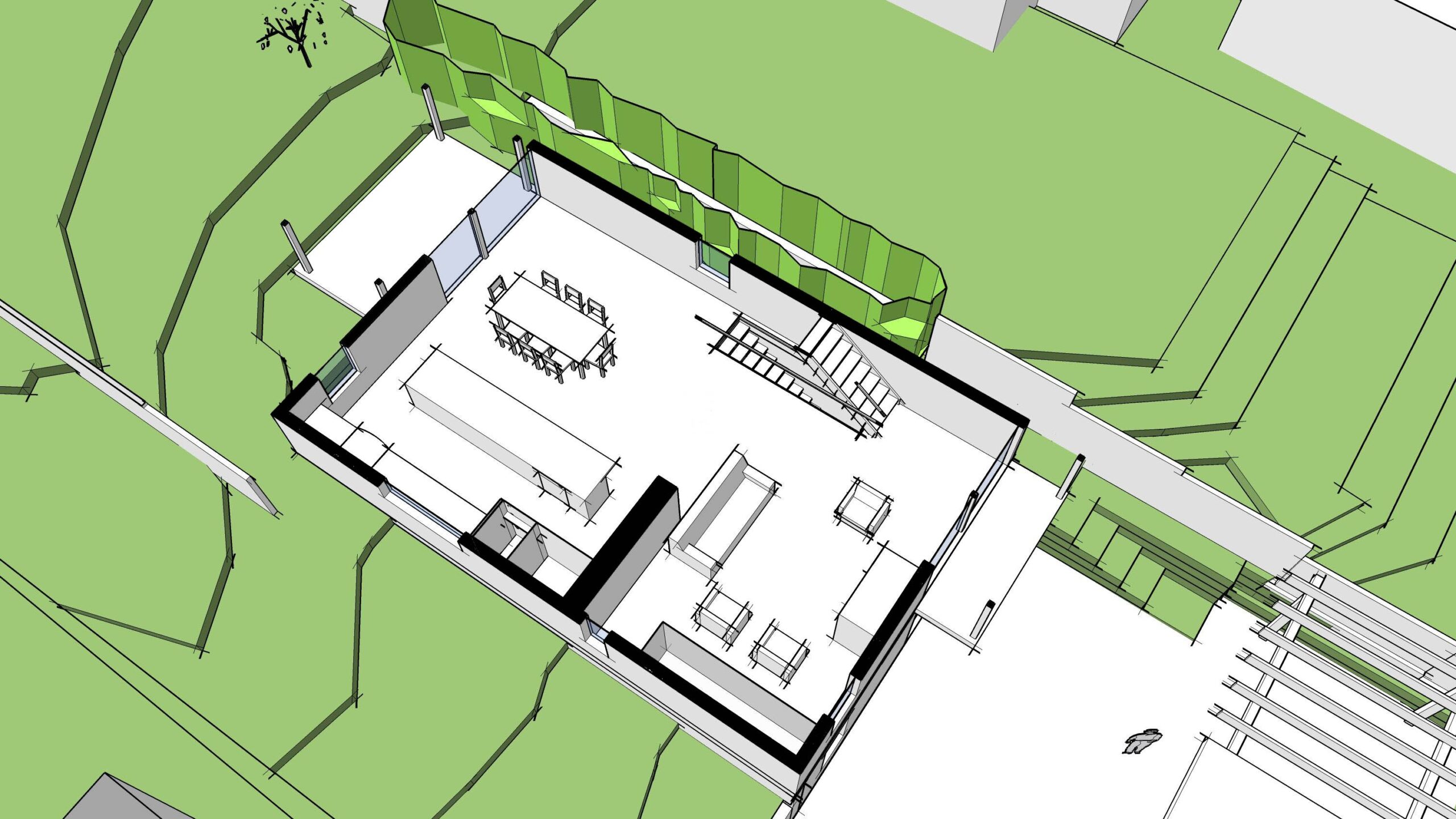 This new home for a young family adapts to and profits from the steep site in downtown Ottawa. The family is tall. Craig (the father) lives in fear of overhead fans. As well, the family has many beautiful things, including books, sculptures, knick knacks, and shoes, and wanted an appealing way to display them. They are also passionate about (and possess many) bicycles.